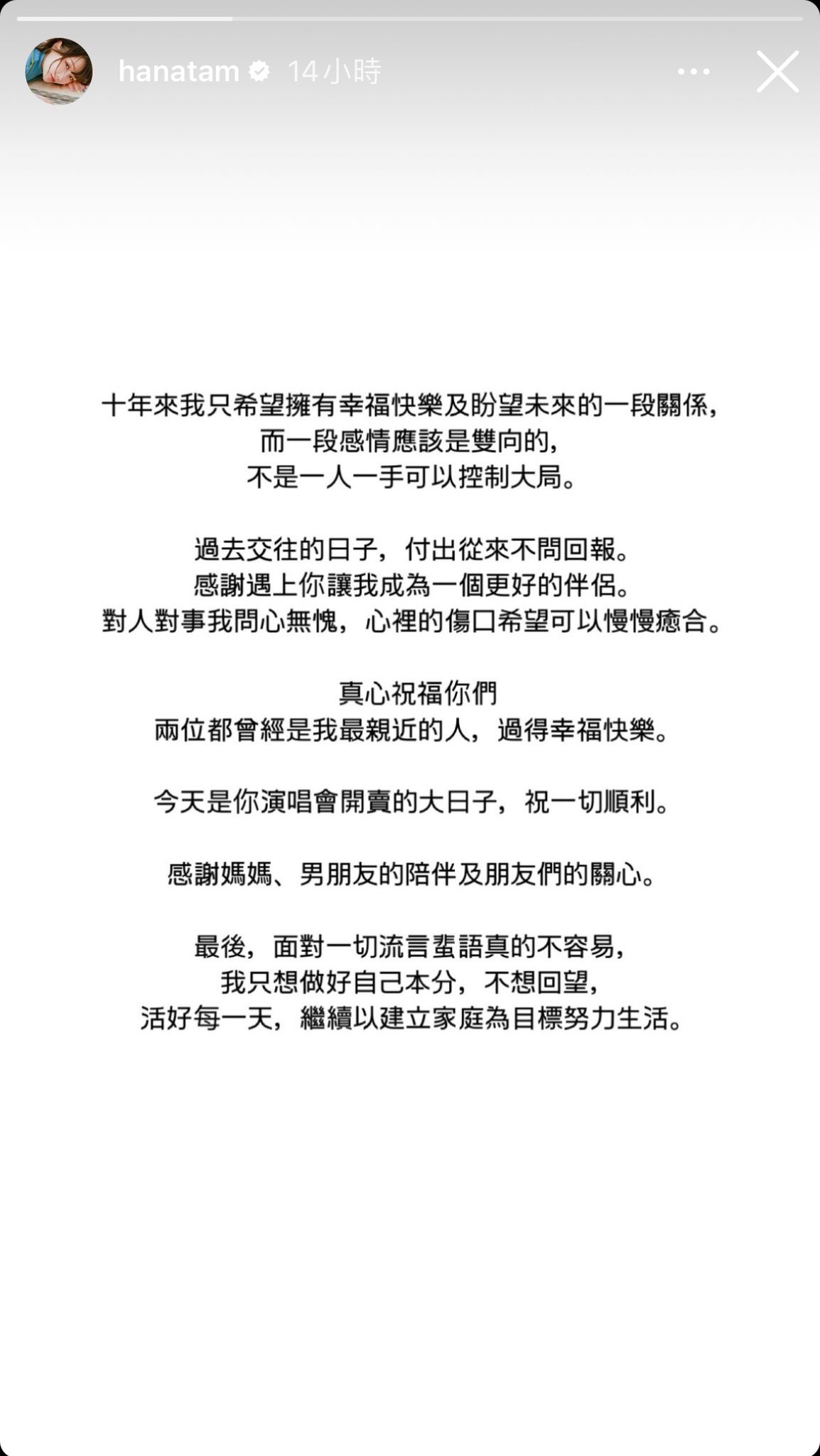 她續說:「今天是你演唱會開賣的大日子,祝一切順利。感謝媽媽、男朋友的陪伴及朋友們的關心。最後,面對一切流言蜚語真的不容易,我只想做好自己本分,不想回望,活好每一天,繼續以建立家庭為目標努力生活」。其中她提到「問心無愧」,似乎是在否認曾在關係中「出軌」,又提到「今日是演唱會開賣的大日子」,似乎是暗指對方為了谷演唱會門票而搏宣傳、博同情 。