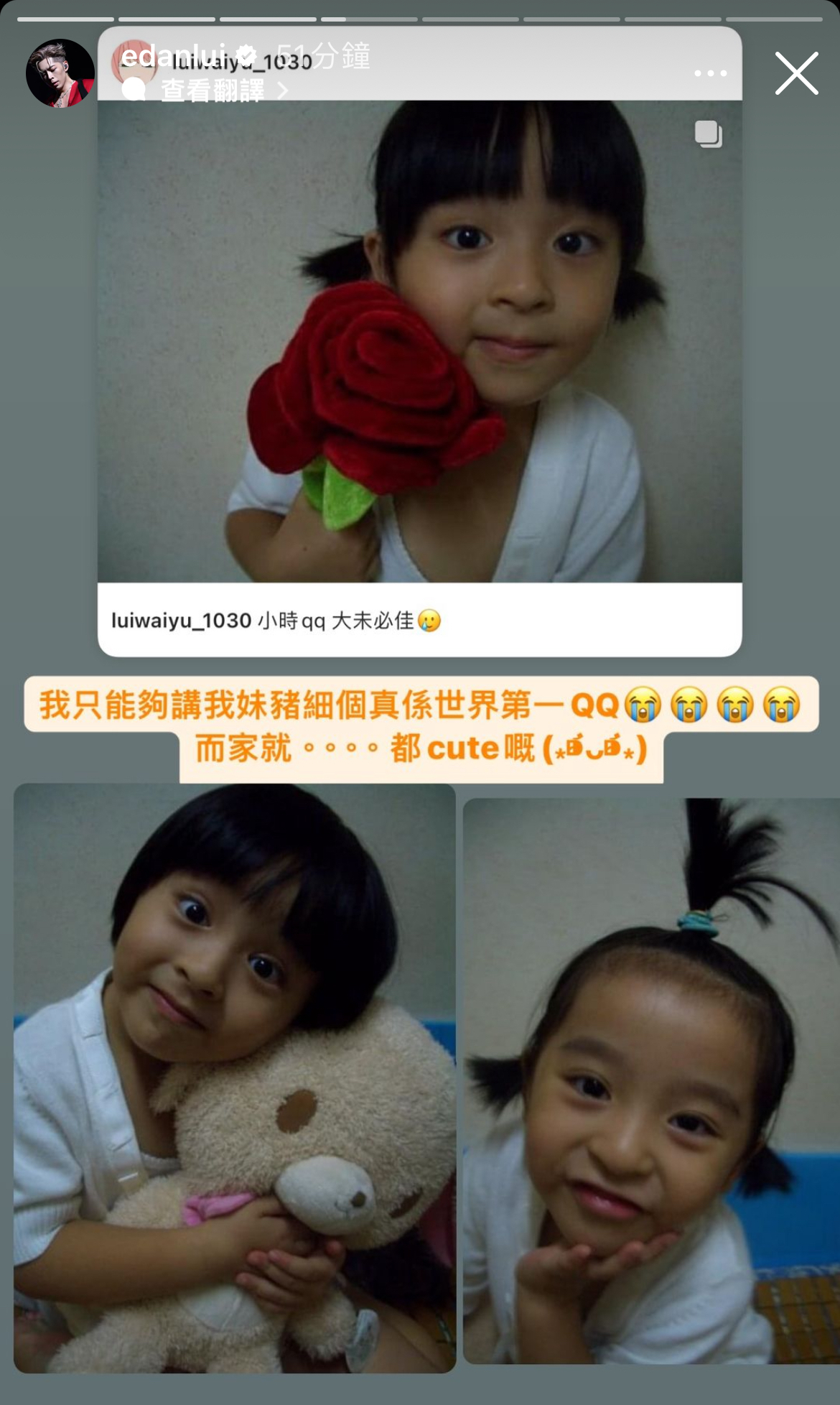 之後「小如豬」還在IG分享多張自己小時候的照片,看得出她明明就眼大大非常可愛,但她竟寫上:「小時qq,大未必佳」,獲Edan留言「Cute死了」。接著Edan還將帖文轉貼到自己的IG Story上,再寫上:「我只能夠講我妹豬細個真係世界第一QQ,而家就。。。都cute嘅」,看得出兩人互動超有愛!