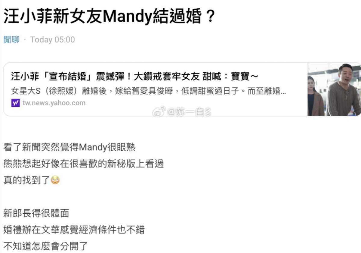 網友爆料表示汪小菲的未婚妻Mandy之前曾經離過婚,更翻出Mandy過去的結婚照,並在貼文中提到:「覺得Mandy很眼熟,熊熊想起好像在很喜歡的新秘版上看過,真的找到了,新郎長得很體面,婚禮辦在文華感覺經濟條件也不錯,不知道怎麼會分開了」。從照片中可以看到,Mandy穿著白色婚紗,手拿著一束花,美麗大方。 而照片中的新郎也很帥氣,網友更大讚前夫英俊瀟灑!兩人看起來非常配。