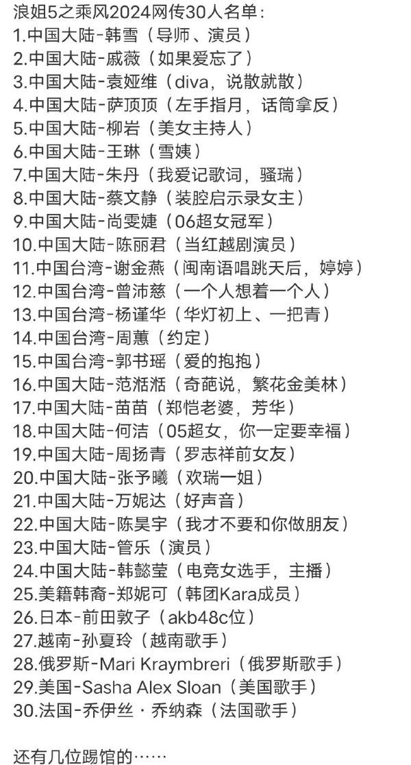 近日,微博也流傳出《浪姐5》的最終名單,名單中有大家熟知的明星如台灣藝人楊謹華、郭書瑤、曾佩慈等,令人驚喜的是韓國二代女團KARA成員Nicole、日本前AKB48王牌成員前田敦子及羅志祥前女友周揚青也出現在名單之中,陣容相當強大。