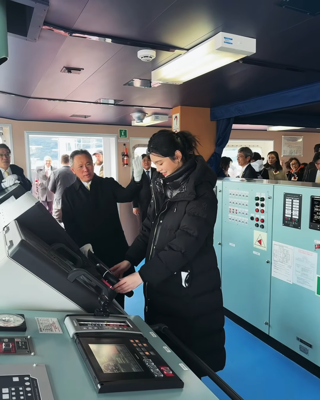 據知,船艦下水前都會舉行「擲瓶禮」,而通常都會由女性主持,藉此祈求新船航行平安。而何家這艘新船是用作航運貨船用途,奚夢瑤更是有入船內駕駛室參觀,又試了試船舵,感覺十分新奇。