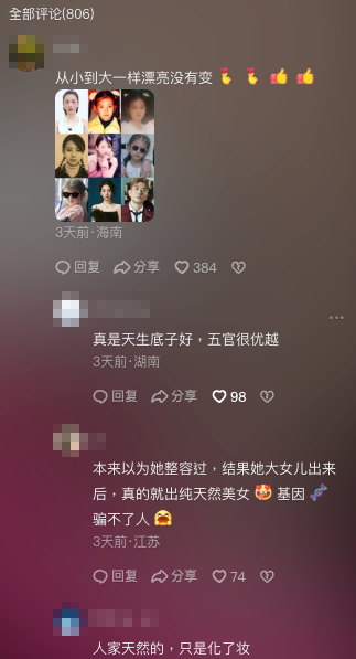 也有不少網民留言大讚她「妝髮好美」、「從來沒有老過」,有網民留言PO出方媛童年以及其女兒的照片,力證她「從小到大一樣漂亮沒有變」,令其他網民也認為她「天生底子好,五官優越」、「本來以為她整容過,結果大女兒出來後,真的就出純天然美女,基因騙不了人」!