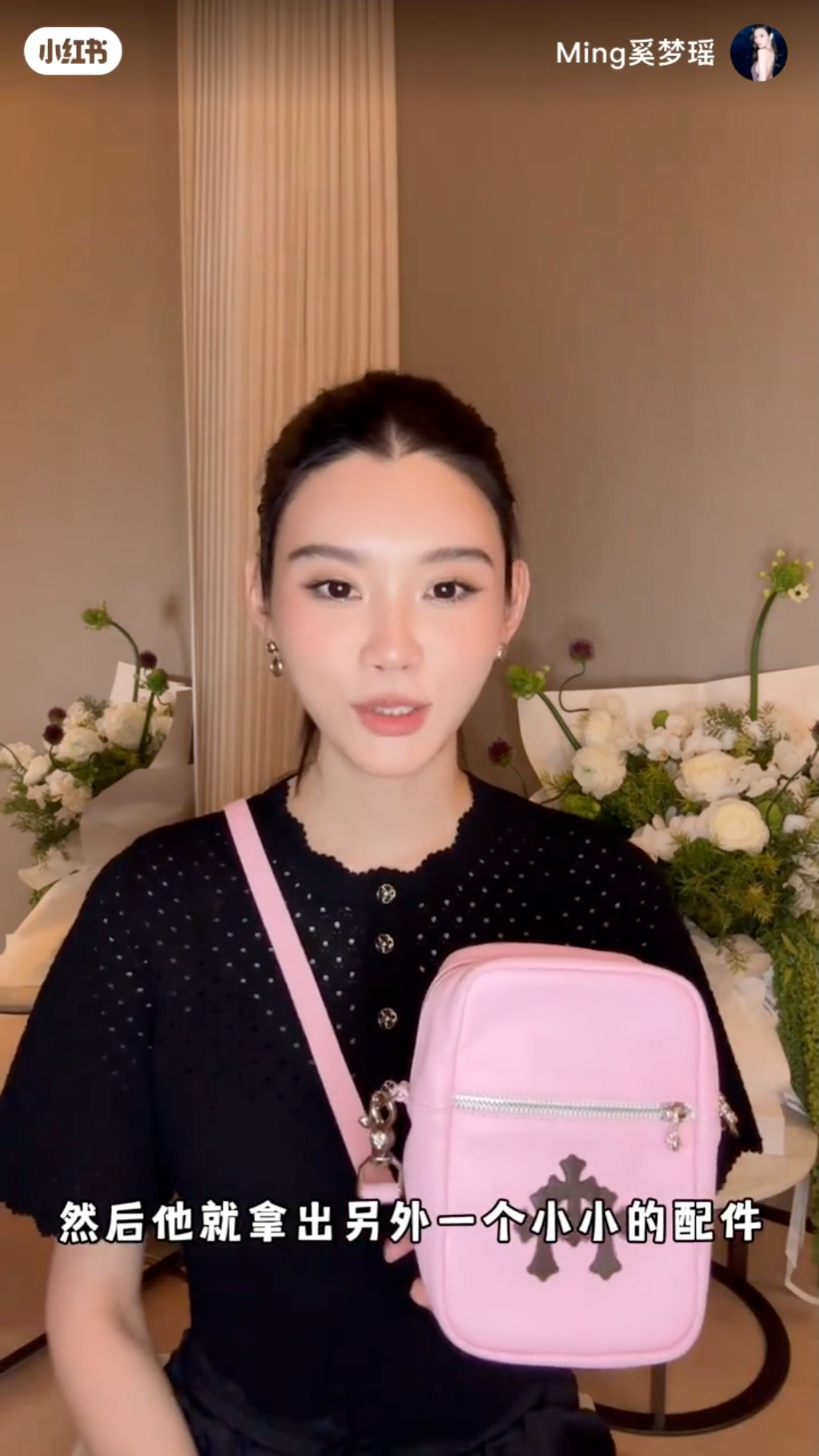 另外,奚夢瑤亦入手了Chrome Hearts售價約為34,800港元的櫻花粉斜背包,她表示當時職員也推介了同款的「小廢包」可用作「耳機袋」,她變一併購買變成為母女裝:「我決定給它配個粉色小鏈子,然後我女兒就可以揹個小小斜背包!」而這款「耳機袋」售價約為9,000港元。其後,她又表示入手了一個Gucci粉紅心心髮夾給女兒襯袋用,髮夾上綴以水晶飾邊及標誌性Logo,價格約為3,100港幣。