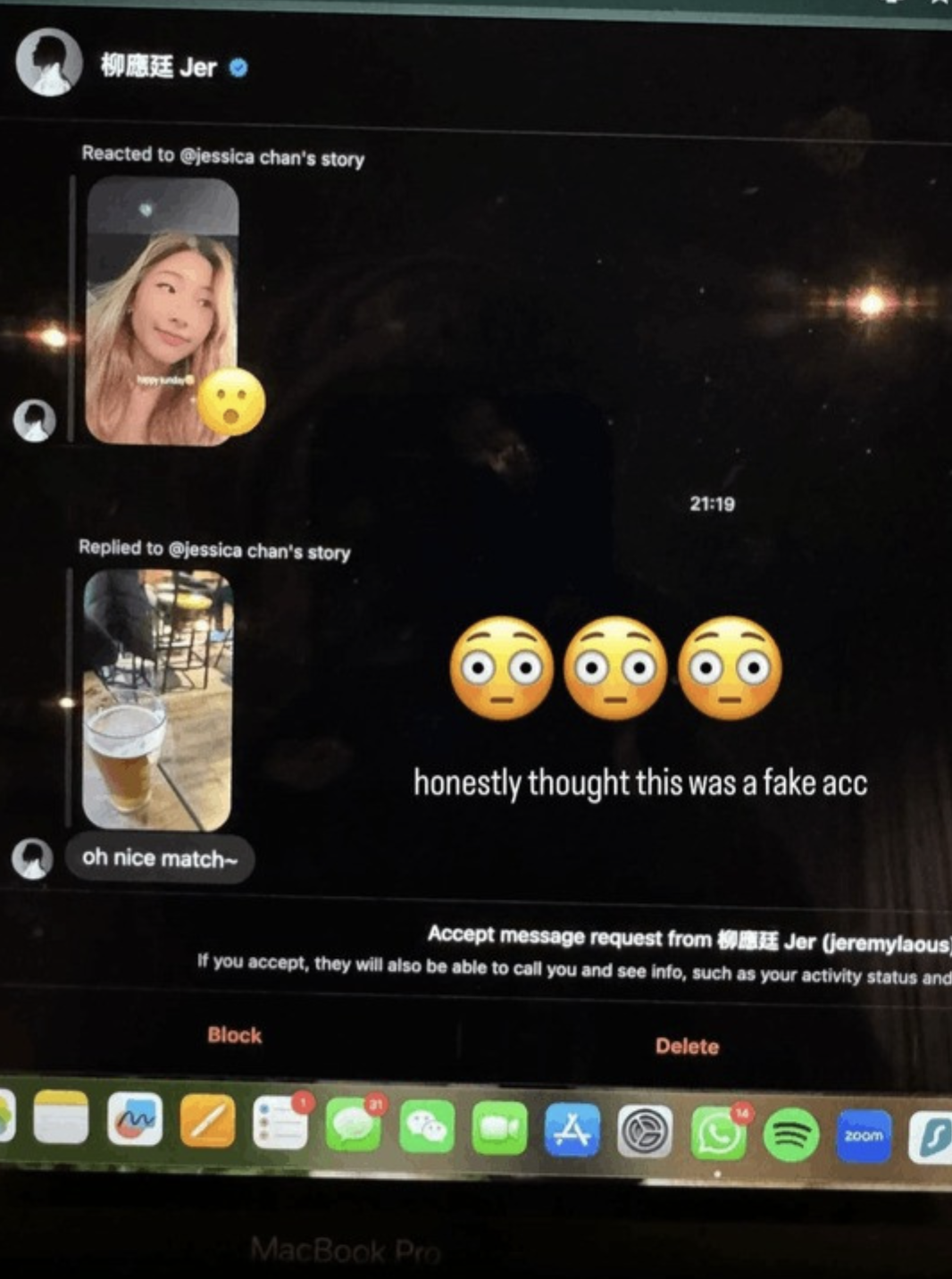 Mirror成員近日完成倫敦演唱會後,就各自休假充電。成員Jer(柳應廷)與Edan(呂爵安)就留在英國一同觀看球賽。不過近日一位名叫Jessica的性感KOL就在社交平台上分享了一張對話截圖,截圖裏可以清楚看到Jer和她的對話。一開始Jer對她的自拍發送了一個「驚奇Emoji」,之後又對她在酒吧觀看球賽表示:「Oh nice match~」。而KOL就留言表示:「Honestly thought this was a fake ACC.」她表示自己本身以為這是假帳戶。