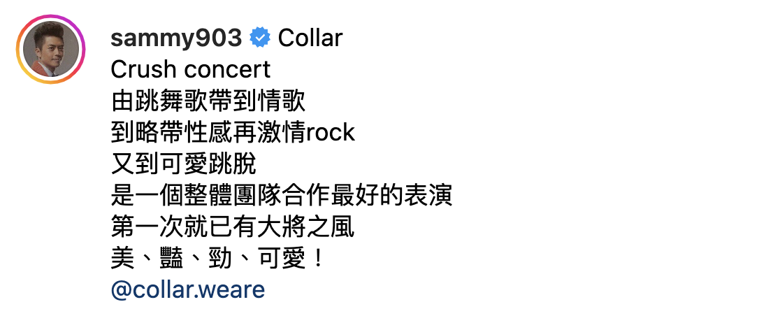近日森美大哥在社交平台上分享了多張COLLAR演唱會的照片,並留言寫道「Collar Crush concert由跳舞歌帶到情歌,到略帶性感再激情rock,又到可愛跳脫,是一個整體團隊合作最好的表演,第一次就已有大將之風,美、艷、勁、可愛!」森美大哥對於COLLAR的首次演唱會給予很高的評價,更大讚成員們有大將之風,是一場非常精彩的演出。