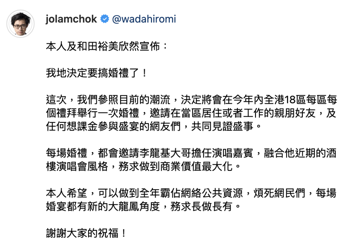 其實林作早在3月頭的時候曾貼出婚照,不過當時被網友問到是否真的結婚時,裕美僅回應了一個笑喊emoji,而林作則表示「暫時不作回應」。但近日林作在愚人節當天突然大曬婚照宣布舉行婚禮!他在社交平台上再次貼出他和裕美的婚照並聲稱自己將會舉辦婚禮。林作更補充自己決定會在全港18區舉行婚禮,而且更會邀請李龍基做嘉賓。他表示最終目的是希望可以做到全年霸佔網絡公共資源,煩死網民。