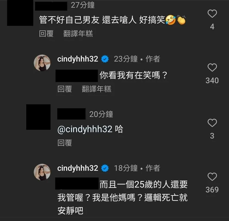 雖然Cindy得到了不少網民的支持,不過亦有部分網民認為Cindy做得太過火。有網民留言表示:「吳卓源更香」,對此Cindy直接回應「你吃到再告訴我香不香,不然你連朱軒洋都不如」。對於有網民指她「管不好自己男友還去嗆人?好搞笑!」,Cindy繼續留言回擊「你看我有在笑嗎?而且一個25歲的人還要我管喔?我是他媽嗎?邏輯死亡就安靜吧!」多次霸氣反擊,讓一眾網友直呼Cindy「型到爆」!