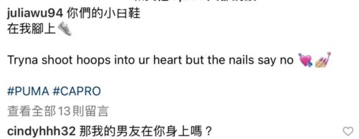 Cindy不僅在IG限時動態截圖相關新聞反擊小三「不知情」言論,還被網民發現一早就得知此消息。在報導曝光前Cindy就在IG限時動態分享了寫下「總是學不會」的建築照,和寫下「哈」的海邊風景照。在稍早時間更被網友發現她直接到吳卓源的IG開嗆。當時吳卓源分享了一則鞋子的廣告貼文,並寫道:「你們的小白鞋在我腳上」。不料正宮Cindy在底下直接留言:「那我的男友在妳身上嗎?」雖然事後Cindy立刻刪文,但還是被網友截圖。