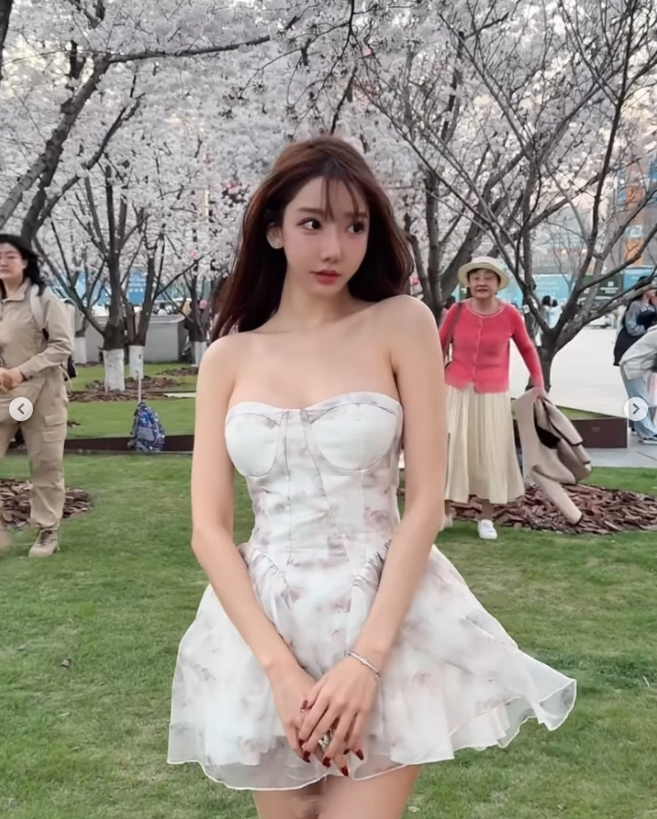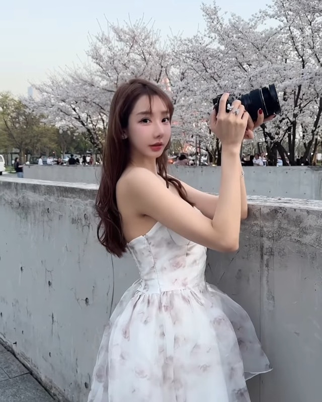最近迎來了觀賞櫻花的浪漫時節,Cammi也約同一位攝影師在上海市某個花園拍攝照片,還出動反光板,非常專業!她身穿一件白色碎花連身裙,大曬性感鎖骨和白滑長腿,身型與以往一樣非常吸睛,令人賞心悅目。而且可能因為Cammi太豔麗,因此吸引了不少在旁的路人也爭相拍照,場面壯觀!