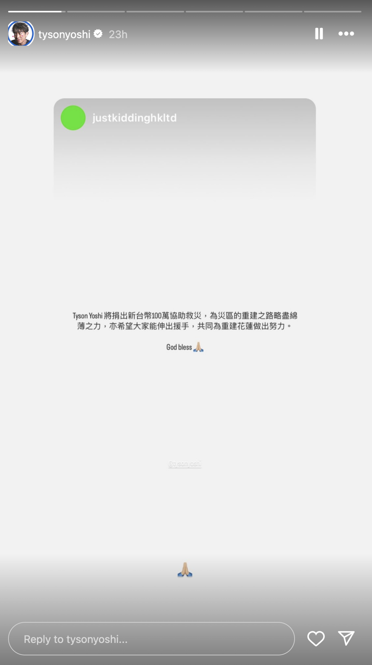 事後Tyson看到新閒發現花蓮成了重災區,所以希望盡一份心力,因此透過經理人公司在社交媒體宣布以個人名義捐出100萬台幣(約24萬港幣)賑災,並呼籲大家一起伸出援手「Tyson Yoshi 將捐出新台幣100萬協助救災,為災區的重建之路略盡綿薄之力,亦希望大家能伸出援手,共同為重建花蓮做出努力。God bless!」。對於Tyson的捐款支持,不少台灣網民都表示非常感動,紛紛在他的社交平台留言感謝。而香港網民對於Tyson成為香港第一位捐款的藝人,都表示以Tyson為傲!