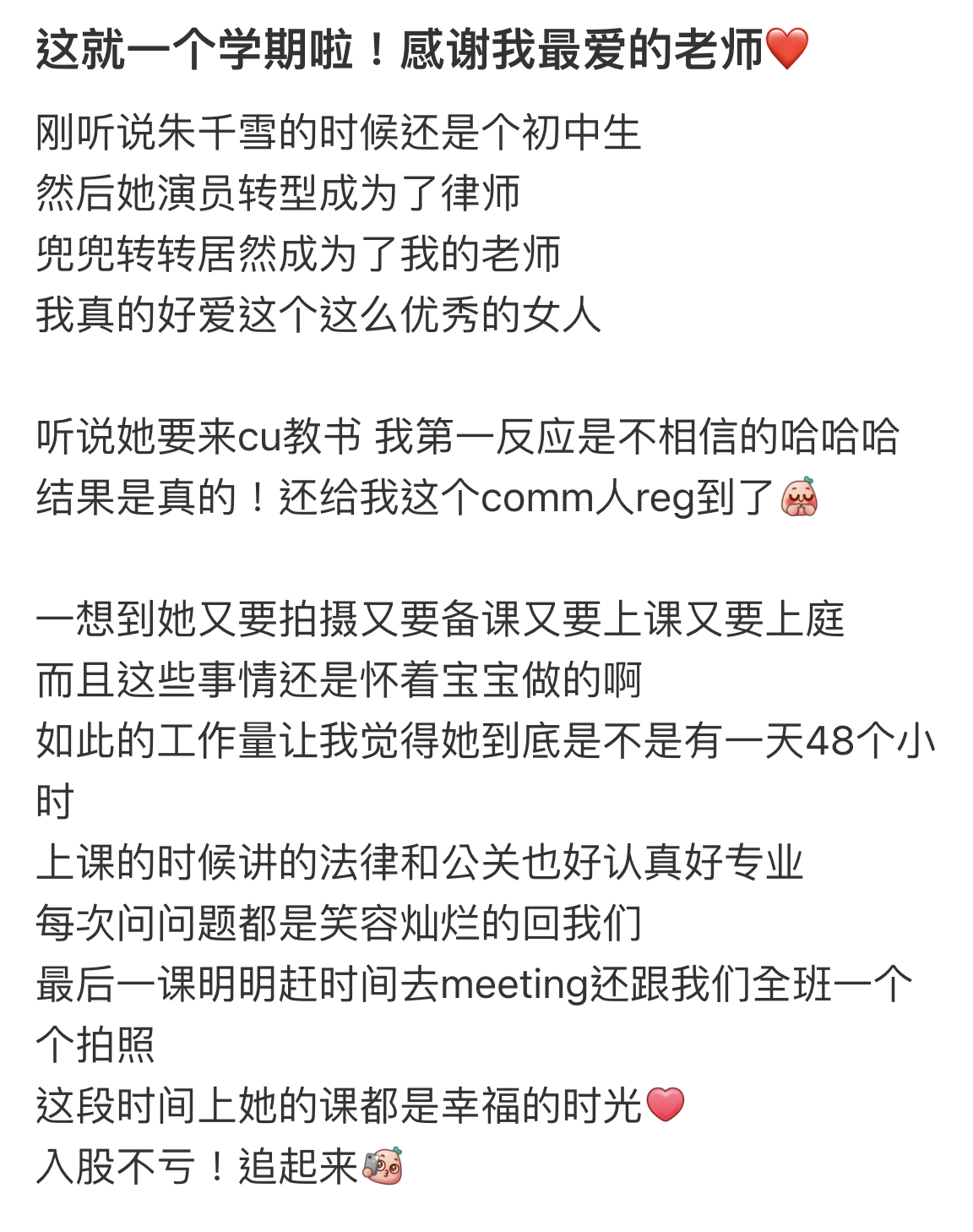 該網友在文中大讚準媽媽朱千雪的的狀態依然明艷照人!更表示朱千雪是一個非常專業的老師,每次問問題時都會滿臉笑容回答。而且更大爆朱千雪不只要備課,還要準備上庭:「一想到她又要拍攝又要備課又要上課又要上庭,而且這些事情還是懷着寶寶做的啊,如此的工作量讓我覺得她到底是不是有一天48個小時。上課的時候講的法律和公關也好認真好專業!」