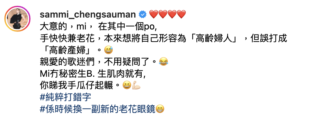 對於留言引發的熱議,Sammi也在IG發文澄清。Sammi表示自己是單純「打錯字」!她解釋本來是想把自己形容為「高齡婦人」,但不知道為什麼誤打成「高齡產婦」。她之後更向粉絲喊話表示:「親愛的歌迷們,不用疑問了。」還自嘲自己是時候換一副老花眼鏡!