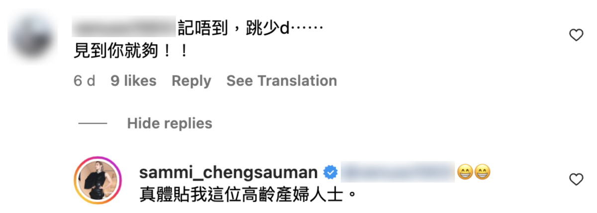 鄭秀文(Sammi)不時都會在IG上和粉絲互動。日前Sammi就在IG上分享了一條綵排的影片,影片地下就有暖心粉絲留言:「記唔到,跳少d..見到你就夠!」而Sammi隨即回覆粉絲:「真體貼我這位高齡產婦人士!」對於Sammi突然自爆自己是「高齡產婦」,不少粉絲都非常震驚,更因此掀起討論熱潮。
