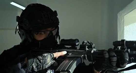 BTS成員在入伍之後,時不時都會有成員近照曝光,讓粉絲能夠及時了解他們的近況。近日V所屬部隊自製宣傳片,正式公開V的近況。宣傳片裡可見V身穿貼有「軍事警察」徽章的黑色作戰服,臉上帶著黑色面罩,炯炯有神兼充滿堅毅的眼神也讓粉絲一眼就認出!而且在影片裡,V拿起裝備槍支準備射擊,畫面猶如拍MV,且每發必中宛如神槍手。