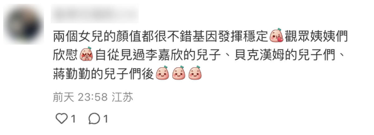 而本是開心的親子樂,網民卻把焦點放在雙胞胎的容貌上!事關雙胞胎的顏值一直以來都是網民的討論話題。由於細女Lyvia的單眼皮及圓潤嘴型與大女Kaylor的雙眼皮及精緻五官略有不同 。因此從以前開始細女Lyvia就慘遭網民吐槽似乎承傳不了熊黛林的良好基因,令網民大呼:不公平遺傳!