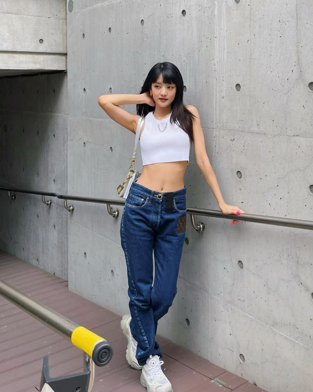 牛仔褲搭配寬鬆的上衣也是不少女生喜歡的組合,一來舒適又休閒,二來不用刻意去左搭右搭也能充滿時尚感~而且寬鬆的白色oversized Tee也是十分百搭的單品,相信大家的衣櫃內總會有一件!像LE SSERAFIM的允眞就輕易著出休閒街頭感,有時她會在白Tee的下擺位置打結來強調腰線,或者加配其他配件及飾品來增加精緻感,大家不妨也參考一下!
