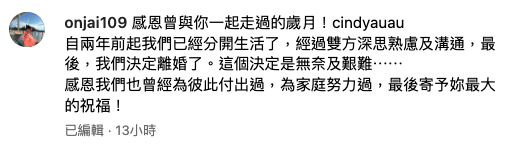 昨晚郭晉安在IG發文寫道:「感恩曾與你一起走過的歲月!自兩年前起我們已經分開生活了,經過雙方深思熟慮及溝通,最後,我們決定離婚了。這個決定是無奈及艱難⋯⋯感恩我們也曾經為彼此付出過,為家庭努力過,最後寄予妳最大的祝福!」,歐倩怡同樣宣布兩人離婚的消息,原來他們早已分居了2年,令人震驚。