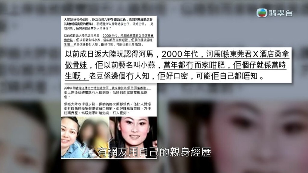 至於被網民指出何太曾在東莞做「骨妹」,當時藝名是「小燕」,與港客有很多不可告人的親密關係。何太立即否認,更稱相中人比自己漂亮得多,何伯亦表示相中人絕對不是何太:「佢個嘴邊有咁大,呢個嘴大啲,佢個嘴好細」。至於又被指曾在卡拉OK做過「領班」,何太又表示只曾在中、西餐廳上班,並指自己當時根本不懂得去做按摩的工作。