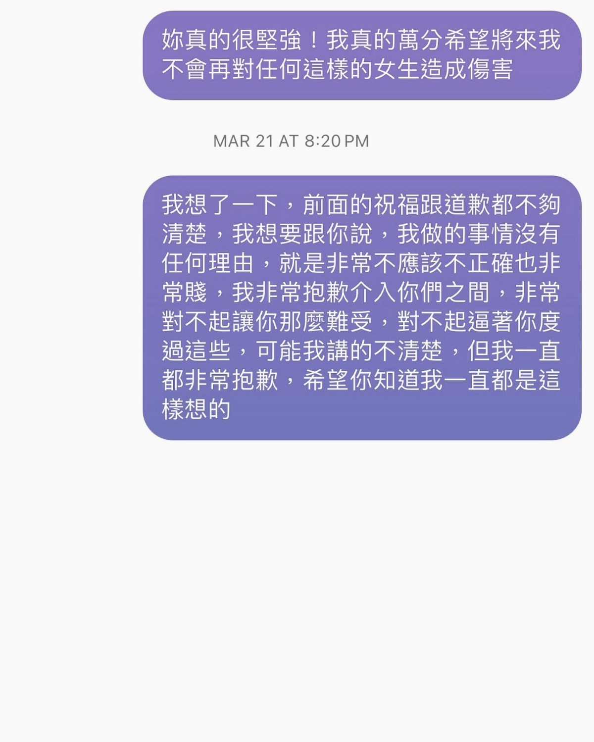 之後有網友在超強的IG貼文下留言,指出原來石靜已經不是第一次做第三者,網友提到自己被短髮女封鎖了,所以只好來這邊留言,她提到自已是曾被石靜介入感情的受害者「希望短髮女之後不要再繼續介入別人的感情囉,之前也是跟我打長篇大論道歉,說不知不覺就有了感覺,沒辦法離開他,說有多愧疚,還是開開心心的當小三,希望這世界可以更加美好」。