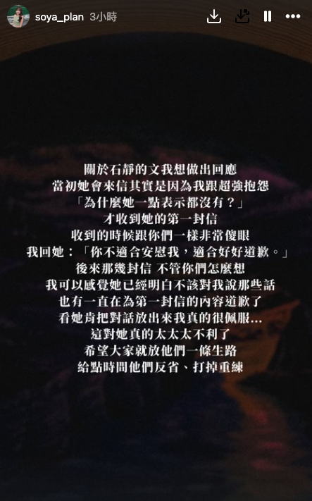 另外由於石靜公開了與Soya的私訊引發了很大風波,Soya也在IG回應了石靜的文章「當初她會來信其實是因為我跟超強抱怨『為什麼她一點表示都沒有?』才收到她的第一封信」坦言收到私訊的時候與大家一樣傻眼,所以回覆了對方「你不適合安慰我,適合好好道歉」,不過之後她感覺對方已經明白不該對我說那些話,希望大家就放他們一條生路,給點時間他們反省、打掉重練,被網友讚是「最佳前度」。