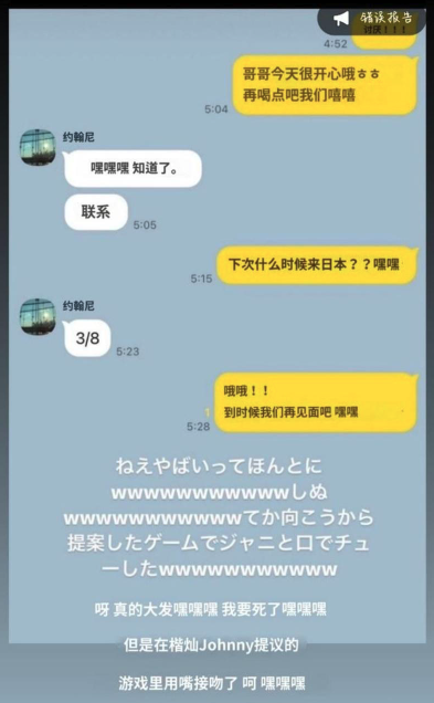 網友很快翻出疑似是陪酒女的IG,指出原來她們都是NCT的粉絲,甚至去過演唱會。當中其中一個陪酒女Miu甚至在IG貼出與Johnny的對話截圖,對話中Miu提到「今天玩得好開心」,對方又答應3月8日會再去日本,網友翻出NCT 127的確在3月8日飛往日本舉行巡演。