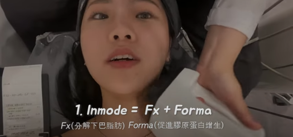 第一部分是Inmode。先是Fx,可幫助分解下巴脂肪,過程有點燙,感覺皮膚被吸起來,剛打完還會有點泛紅。