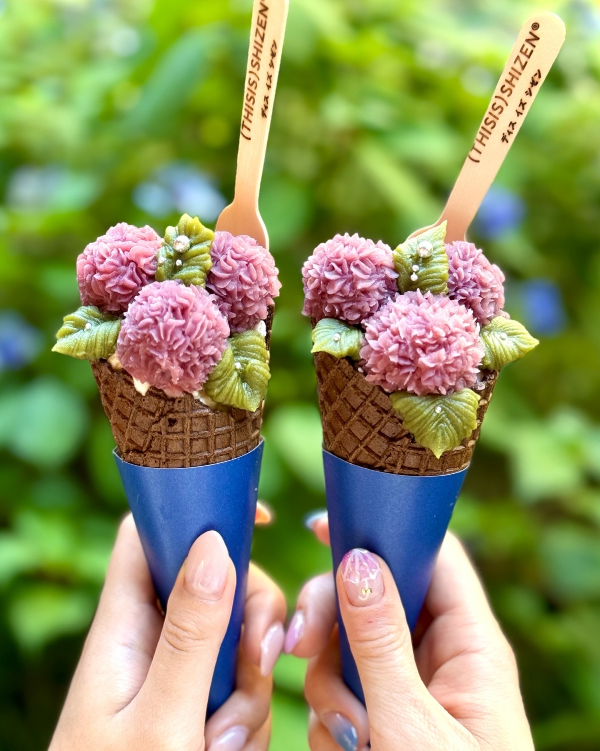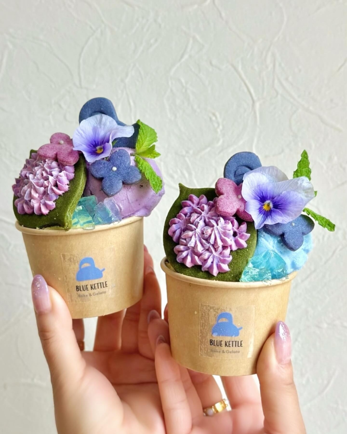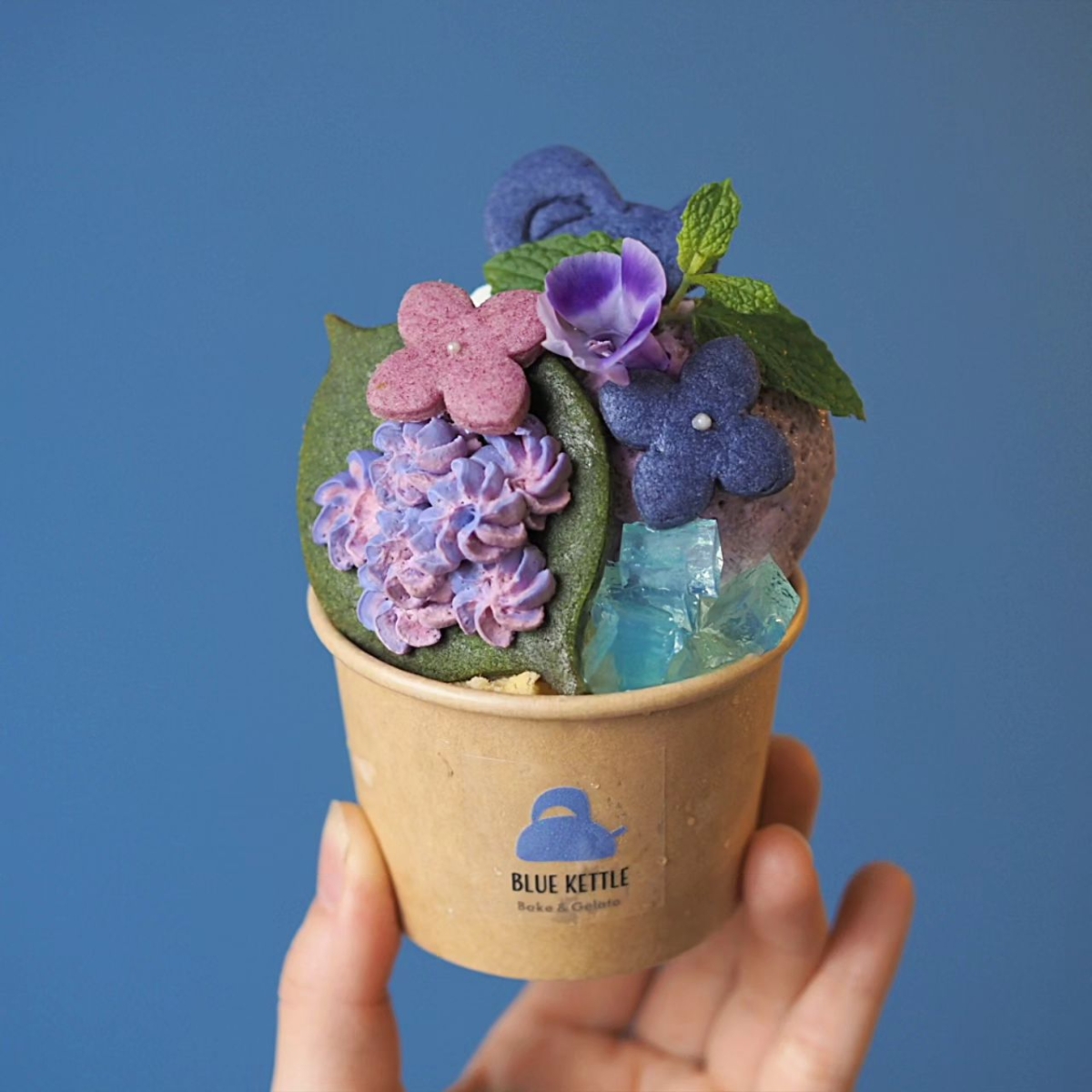 位於大阪的雪糕店BLUE KETTLE每年都會推出繡球花雪糕,繡球花雪糕的部分是牛奶、黑加侖子、藍莓及芝士配合而成的口味,雪糕上放著繡球花造型的曲奇、啫喱及花瓣,外型超Igable~
