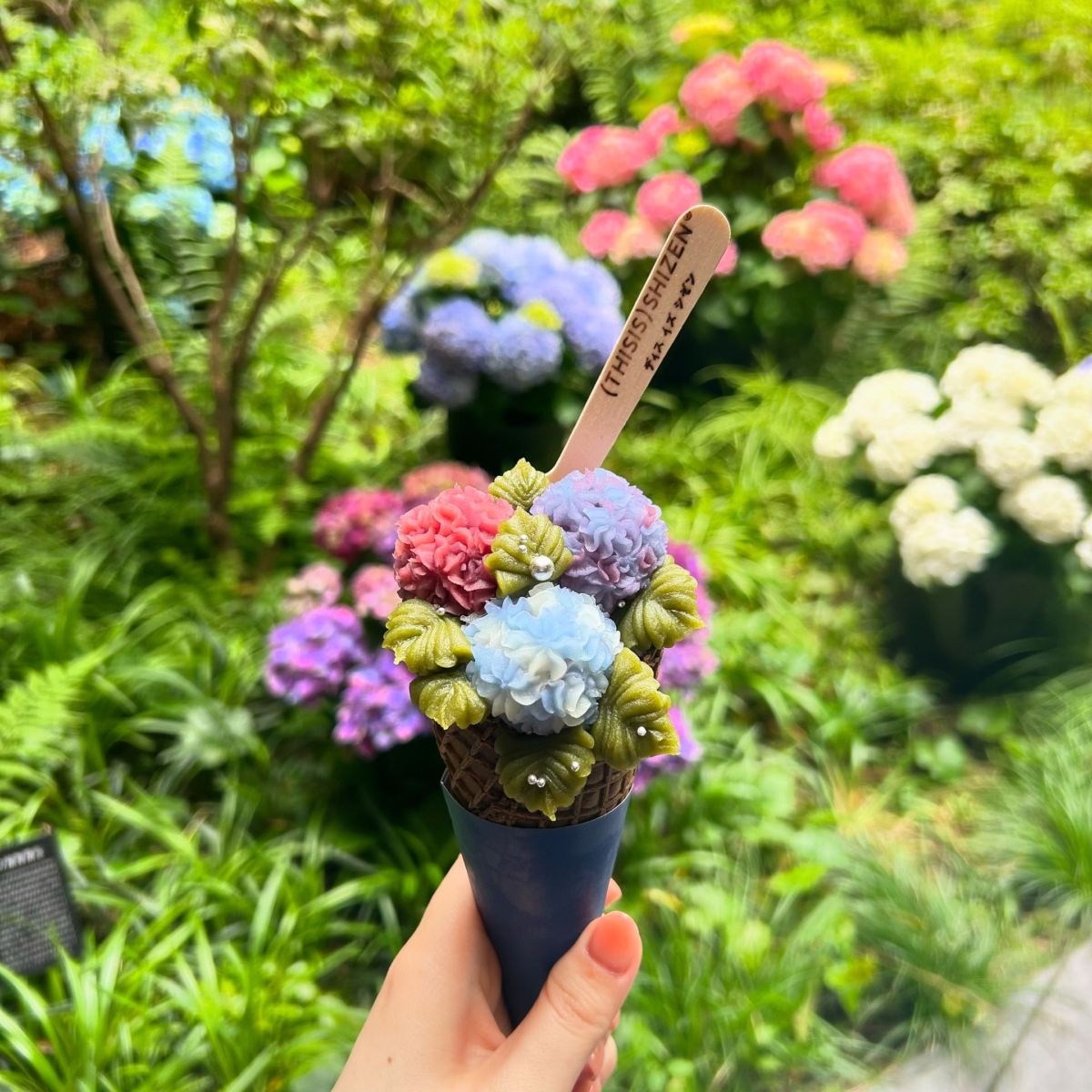 京都有不少欣賞繡球花的名勝景點,當然可以吃到不少繡球花的甜品啦!這間位於京都新風館內的「(THISIS)SHIZEN」,最人氣的是立體繡球花雪糕筒,朱古力窩夫筒裡裝著雪糕,上面有一朵朵不同顏色立體「繡球花」,原來「繡球花」是人手以豆蓉製成,看上去漂亮又好食!