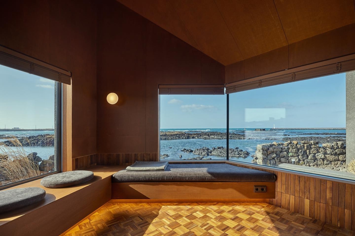 這間位於濟州島朝天邑的民宿「NYEOK」是村內最近大海的地方,房子建在海邊,酒店由兩個小玄武岩房子組成,設有一個恆溫泳池,都面朝大海,附近的景觀令到民宿別具特色!