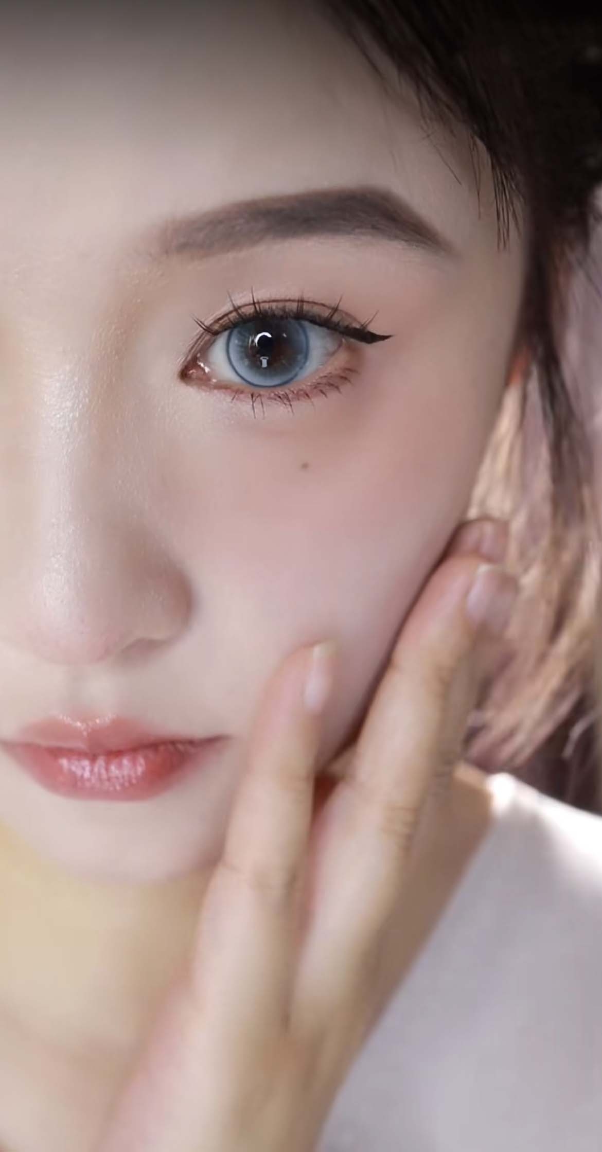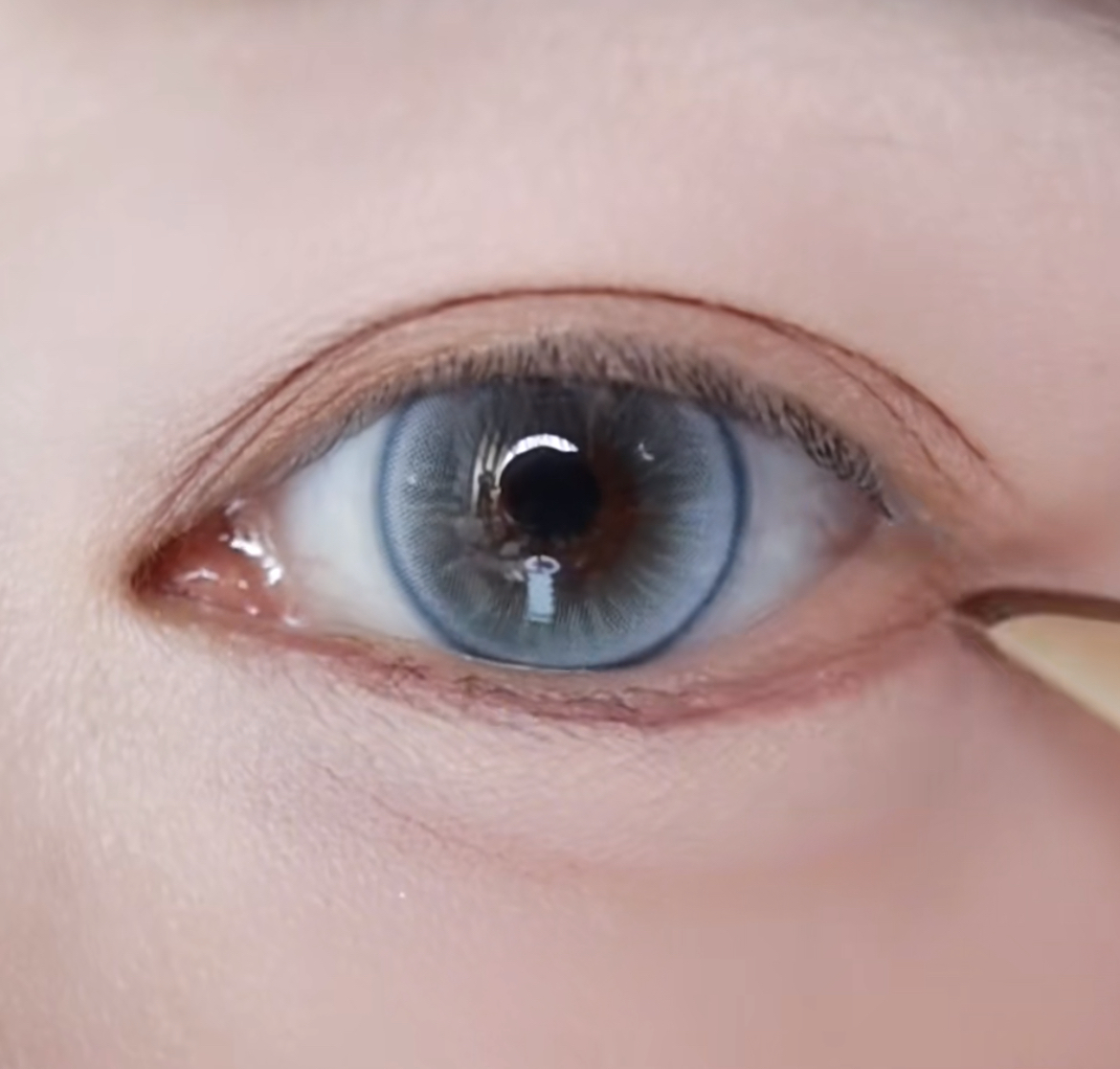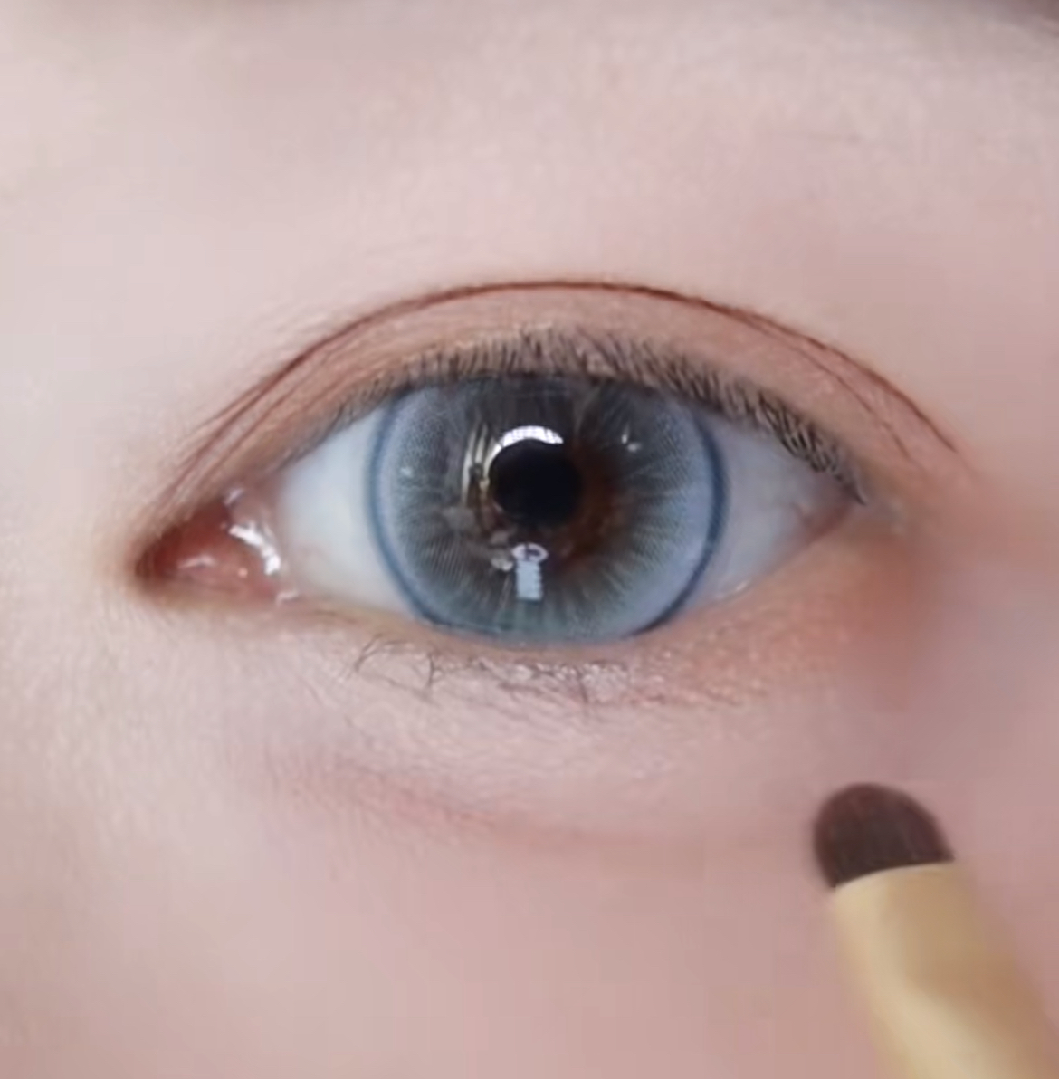 先沾取淺粉色眼影大面積掃在整個眼皮作打底,再沾取粉灰色疊加在眼頭,再沾取藍色疊加在後眼尾,中間記得要暈染均勻,之後用修容色畫出卧蠶,再沿著睫毛加深眼頭和眼瞼下至,最後掃上睫毛膏和拉出眼線即完成了!