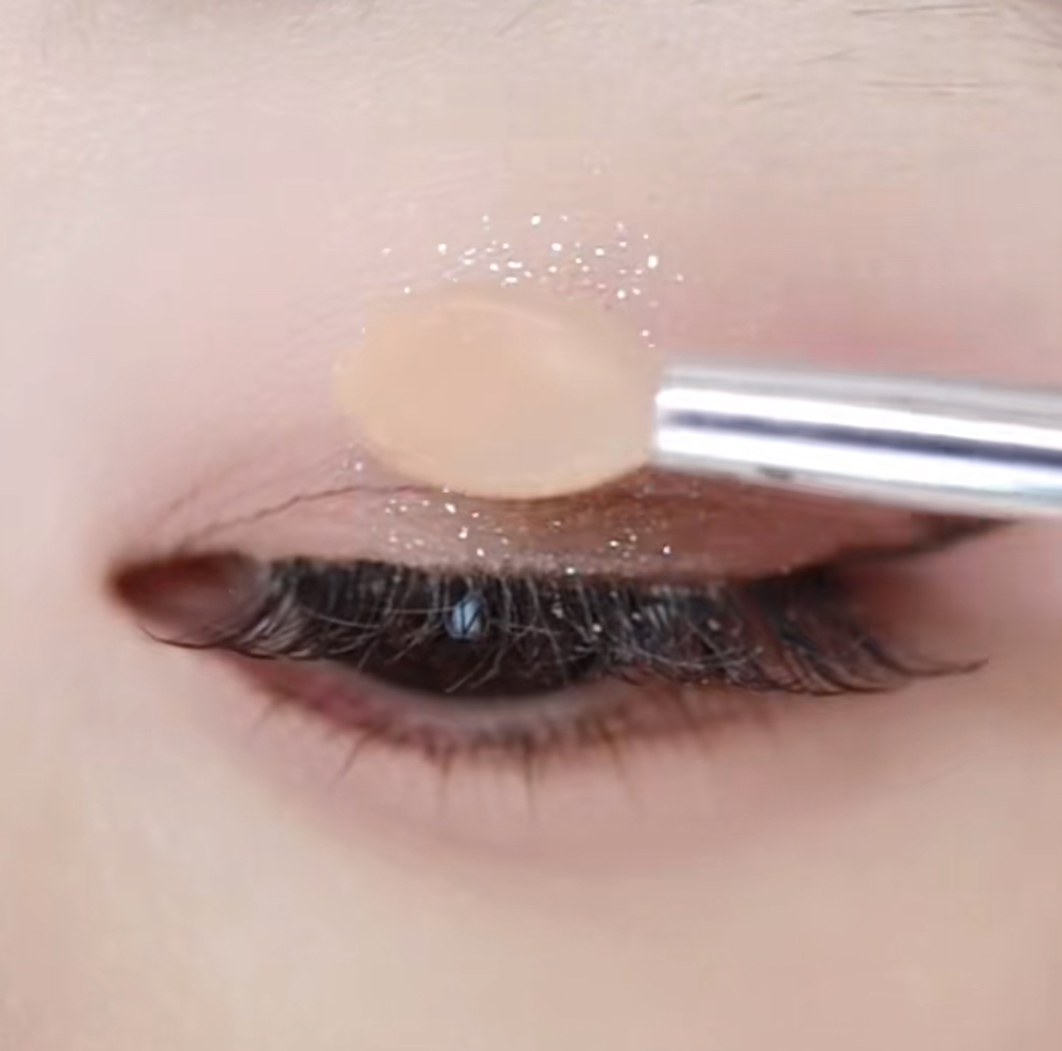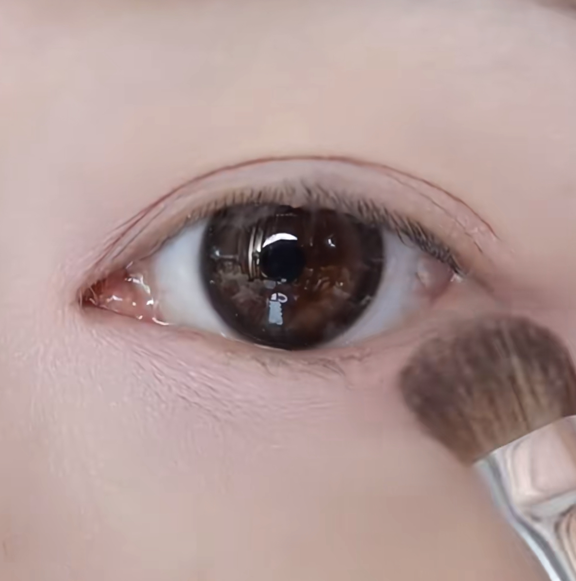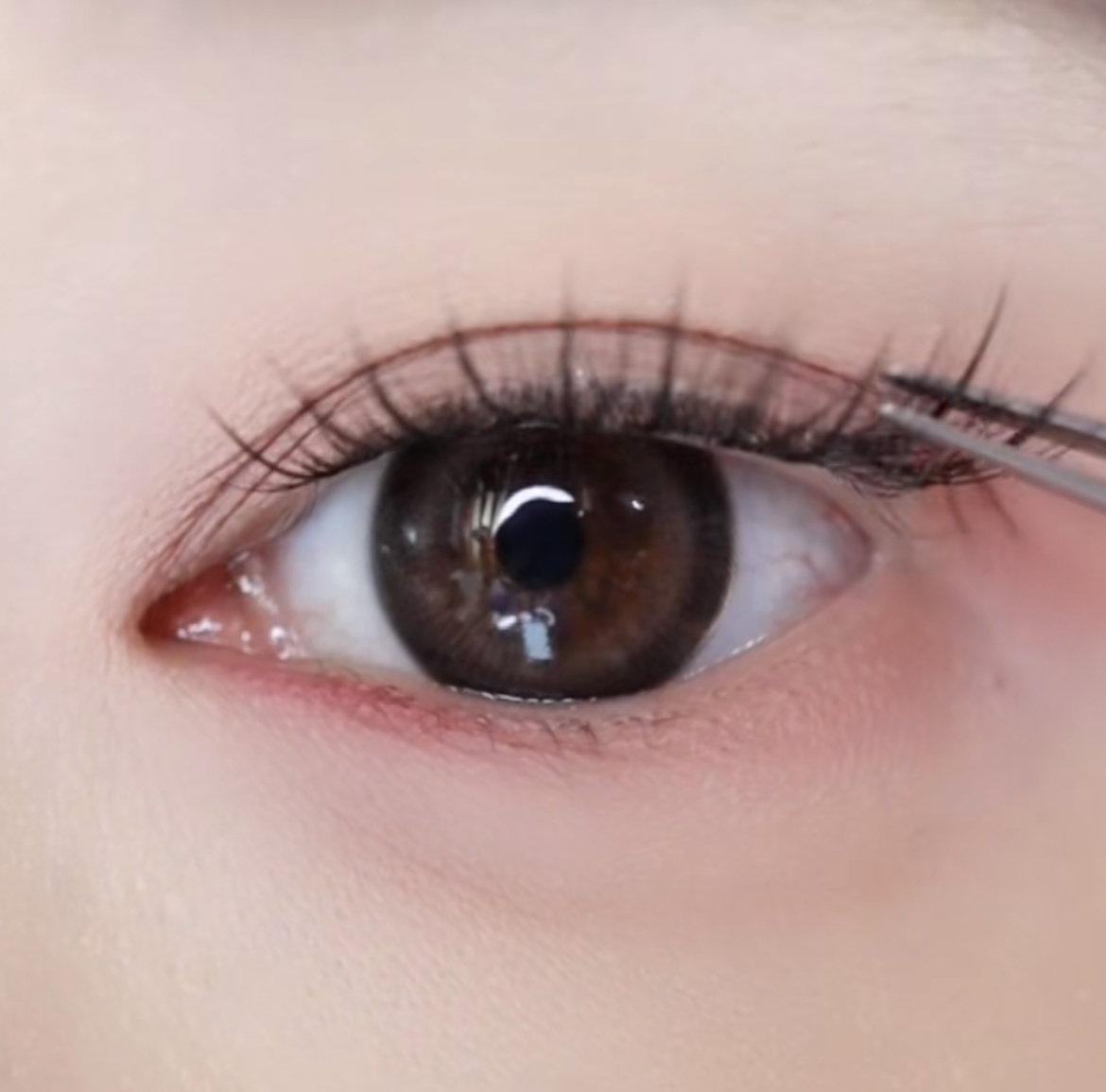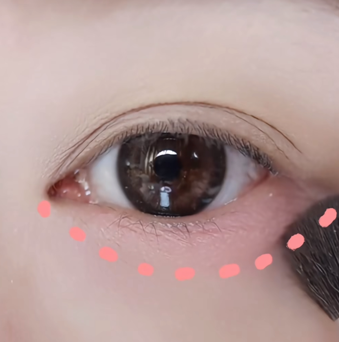 先沾取修容色掃在上眼皮作打底,再沾取粉色暈染下眼皮,再痴上假睫毛。然後沾取淺啡色眼影暈染眼瞼下至,餘粉帶過卧蠶陰影,再提亮眼頭和畫下垂眼線,即完成了!