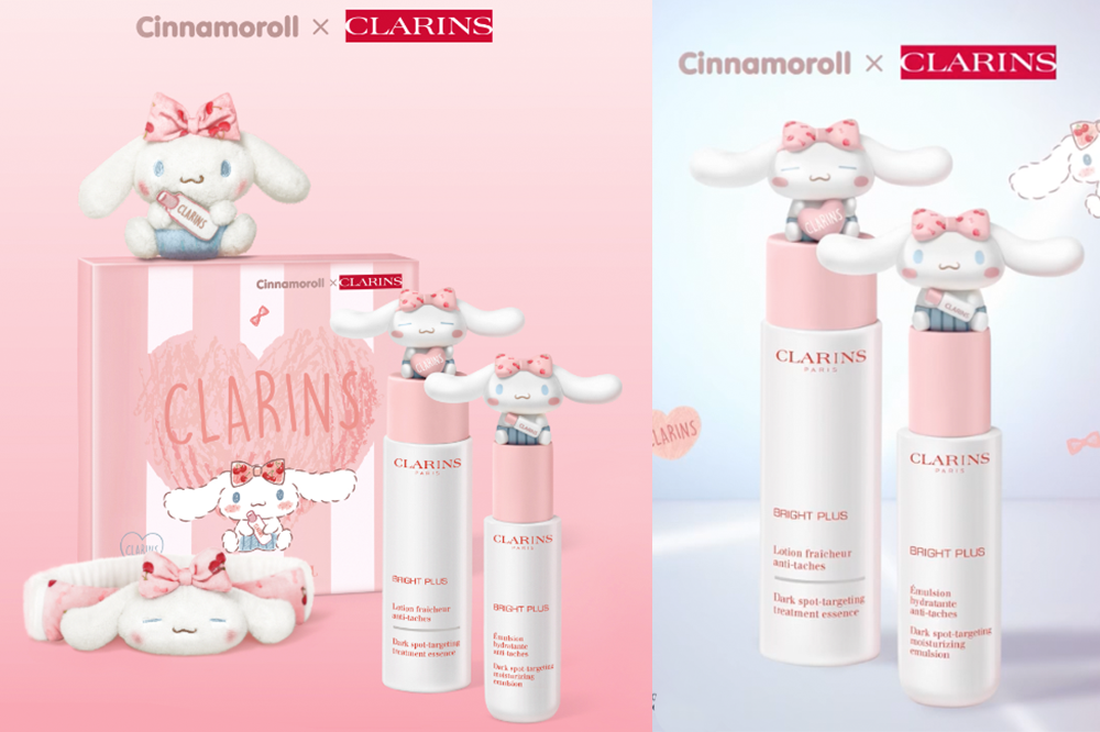 今個夏天Clarins還與Sanrio人氣角色Cinnamoroll聯乘,推出「透亮光感牛奶肌限定套裝」,以櫻桃作為設計元素,套裝包括有超軟萌Cinnamoroll髮帶、毛公仔吊飾及瓶蓋,超可愛包裝令人超期待每日的護膚時間!
