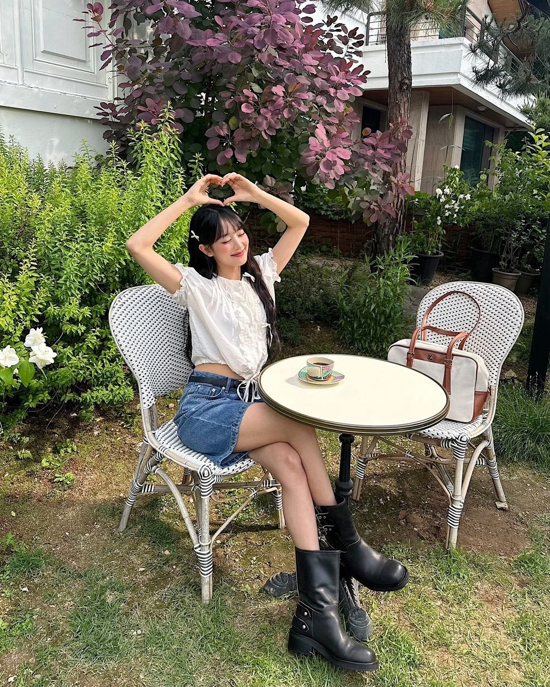 如果覺得長裙很厚重,也可以試試減去裙子的長度,以短裙做搭配,不僅充滿夏日風情,還能露出細腰及長腿,能夠拉長線條比例!好似(G)I-DLE米妮一樣,白色花邊上衣搭配牛仔短裙,混搭一對黑色皮靴,清爽之餘還帶點帥氣,輕鬆穿出清爽時尚感!