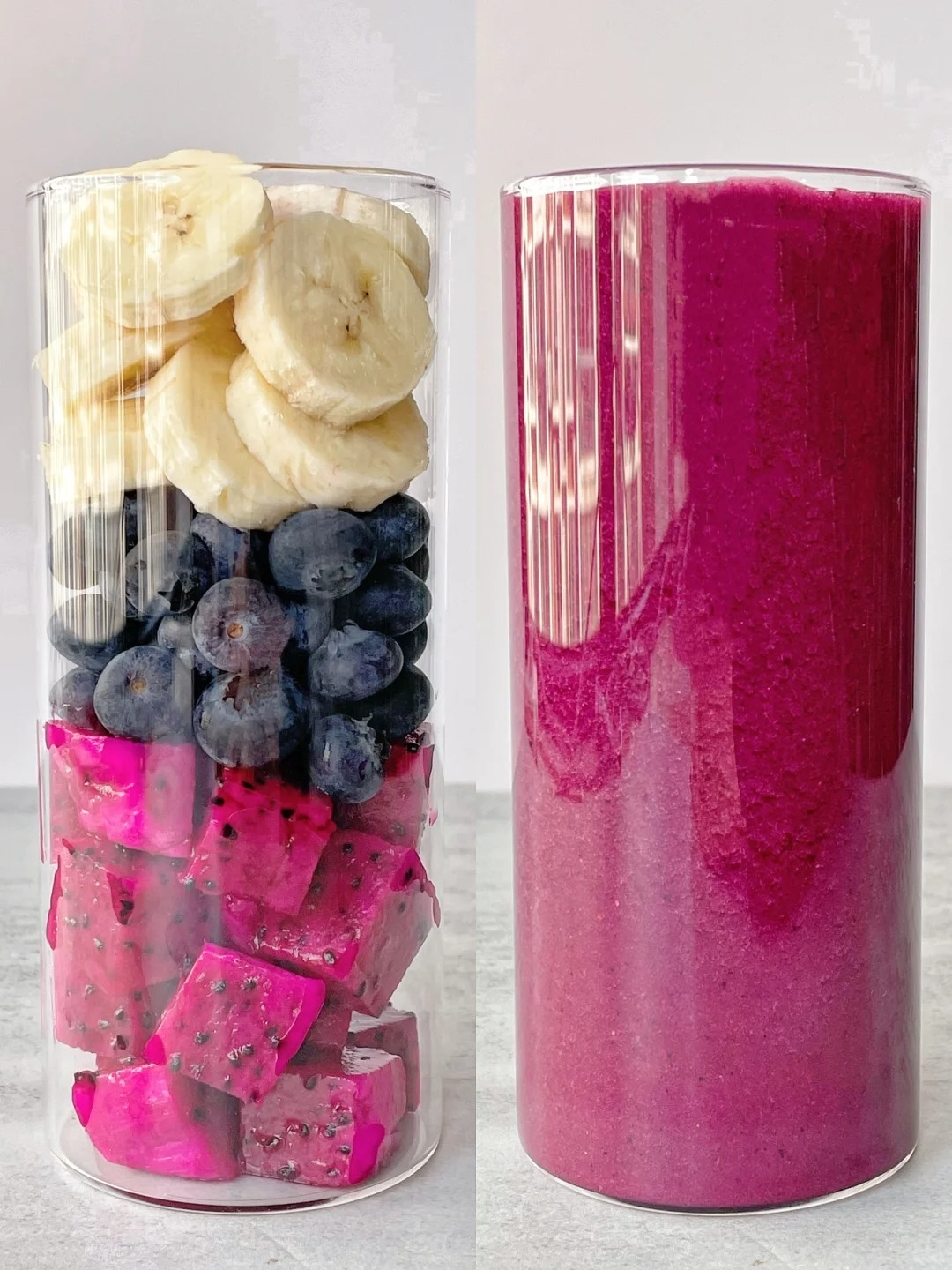 所有水果都富含維生素和抗氧化劑。火龍果含有維生素C,有助美白皮膚;香蕉富含鉀元素,可以滋潤肌膚;藍莓富含抗氧化劑,有助延緩皮膚老化。桑莓果汁不僅提供額外的維生素C和抗氧化劑,還能讓口感更美味。