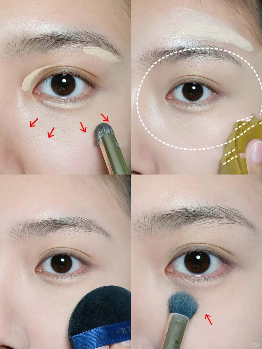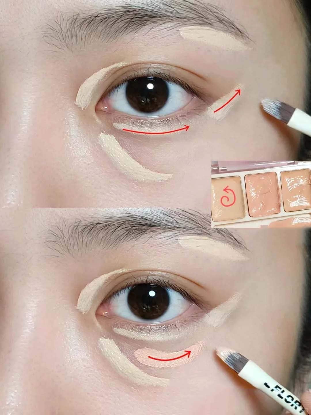 先沾取淺米色遮瑕塗在淚溝、眼頭、眼尾、眉骨、臥蠶位置,幫助提亮凹陷和均勻膚色。再沾取橘色遮瑕塗在黑眼圈位置,幫助中和眼下泛青瑕疵。