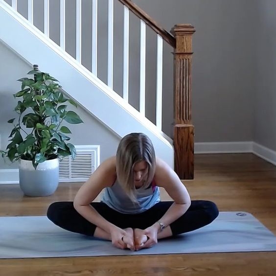 這個動作先坐在墊上,然後屈膝並腳掌相合,腳跟盡量靠向腹股溝,可以放鬆髖關節,促進骨盆內的血液循環,治療婦科不適症狀。