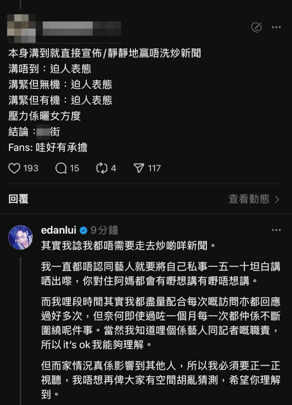 當中亦有網民質疑純屬新聞炒作,Edan亦有大方回應:「其實我諗我都唔需要走去炒啲咩新聞。 我一直都唔認同藝人就要將自己私事一五一十坦白講哂出嚟,你對住阿媽都會有嘢想講有嘢唔想講。 而我哩段時間其實我都盡量配合每次嘅訪問亦都回應過好多次,但奈何即使過咗一個月每一次都仲係不斷圍繞呢件事。當然我知道哩個係藝人同記者嘅職責,所以it's ok我能夠理解。 但而家情況真係影響到其他人,所以我必須要正一正視聽,我唔想再俾大家有空間胡亂猜測,希望你理解到」。