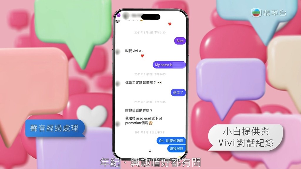 今年25歲從事運輸業的小白,三年前在社交平台被Vivi主動要求加好友,並開始問問題,例如興趣、年紀、喜好等,起初小白都有所戒備,但對方表示只是想認識朋友,其後自覺精明的他立即在網上調查對方,發現有人曾聲稱被她欺騙,指見面後只是購買美容療程。小白隨即質問Vivi,但對方卻表示是抹黑,更叫他要相信她,最終小白被說服。