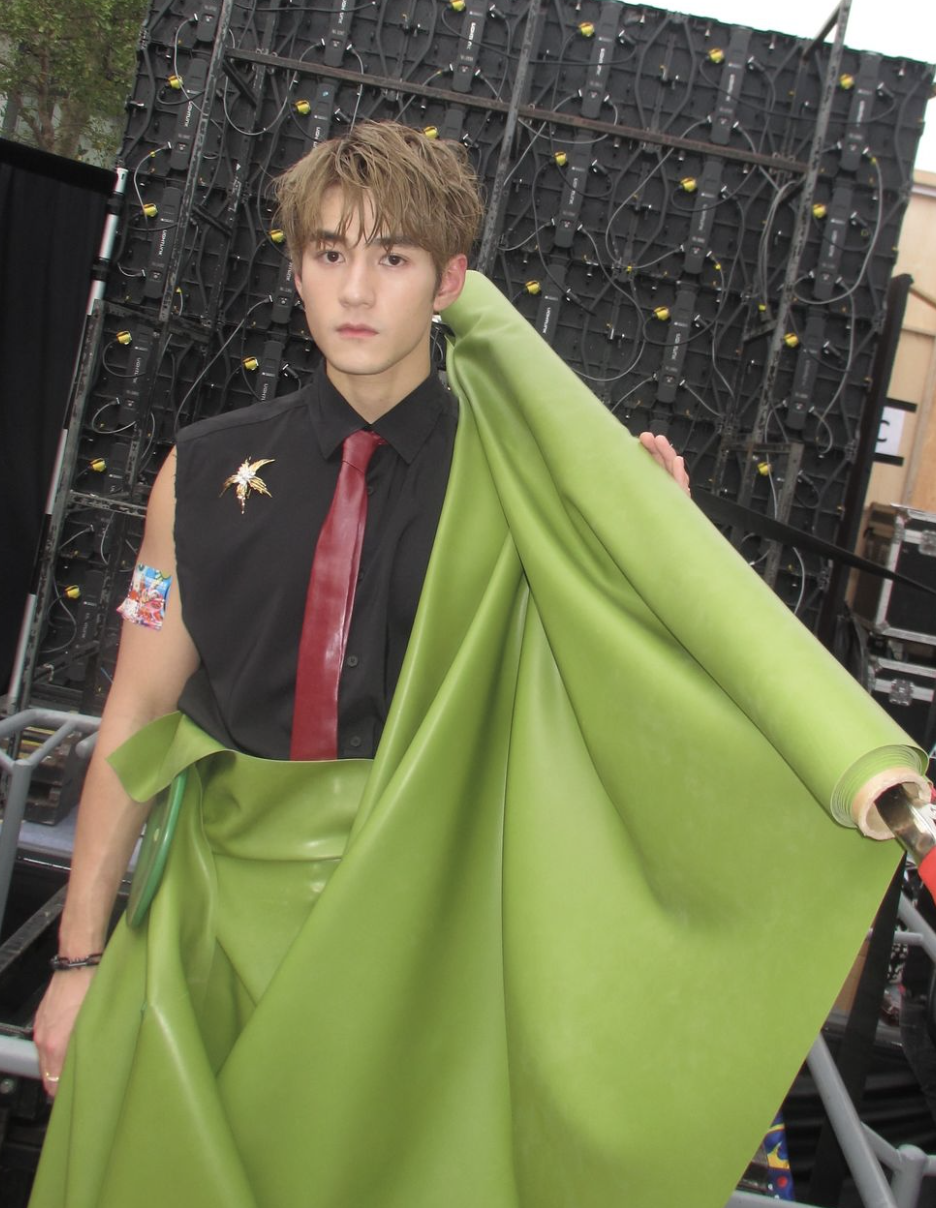 去年取得叱咤生力軍男金的Jeffrey(魏浚笙),今年記招穿搭可謂相當吸睛!見他身穿一件設計相當獨特的草綠長裙登場,一出場更高舉連著裙擺的「綠幕」,搞鬼之餘順道大騷超結實手臂瞬間成為全場焦點!