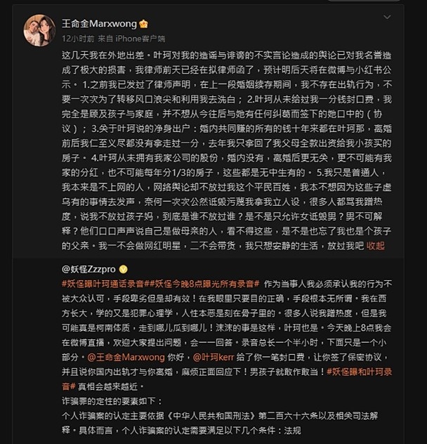 早前有傳內地男星黃曉明為葉珂已花近千萬人民幣,網上又流出女方求饒的電話錄音,葉珂之後更宣布因身體不適和家人原因而退出網路。但日前葉珂的前夫王命金在網上發文列出5點反擊葉珂,並宣布要提告前妻,引起大眾熱議。