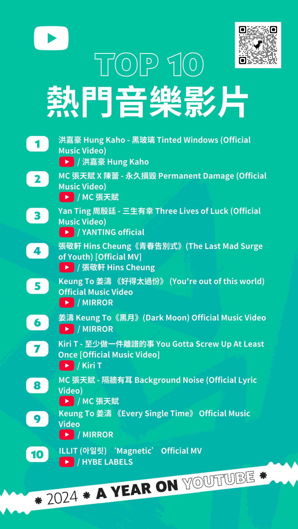 榜首的位置由洪嘉豪的《黑玻璃》奪得,緊隨其後的是 MC張天賦與陳蕾合唱的《永久損毀》,第三名是周殷廷的《三生有幸》。張敬軒的《青春告別式》則排在第四位,MIRROR男團成員姜濤再次證明了他的音樂實力,有三首歌曲上榜,其中《好得太過份》排名第五,《黑月》排名第六,《Every Single Time》則拿下第九位,而Kiri T的《至少做一件離譜的事》成為榜單中的第七名。在第八的位置,看到了MC張天賦的另一首作品《隔牆有耳》。韓團ILlIT出道曲《Magnetic》則是第十名。