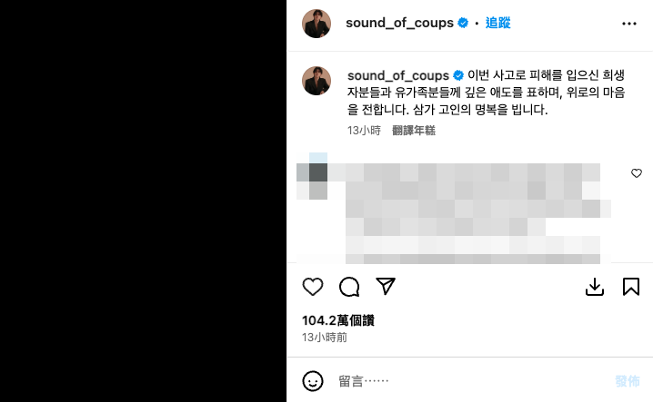 韓國濟州航空(Jeju Air)一班從泰國曼谷出發載有181人的客機在12月29日發生空難,事故導致179人罹難,僅2人生還,最年幼的罹難者僅3歲,韓國政府宣佈即日起全國哀悼至2025年1月4日。在意外發生後,有韓媒曝光多張乘客在墜機前傳給家人的訊息截圖,內容令人傷感,不少圈中藝人都有在社交平台發文悼念。