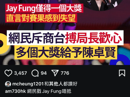 在《叱咤樂壇流行榜頒獎典禮2024》順利舉行後,有不少網民對於馮允謙(Jay Fung)在「男歌手金獎」、「唱作人金獎」和「至尊唱片大獎」均不敵陳卓賢(Ian)而感到不滿。而張天賦(MC)也被發現讚好了一些對賽果有爭議的報道。