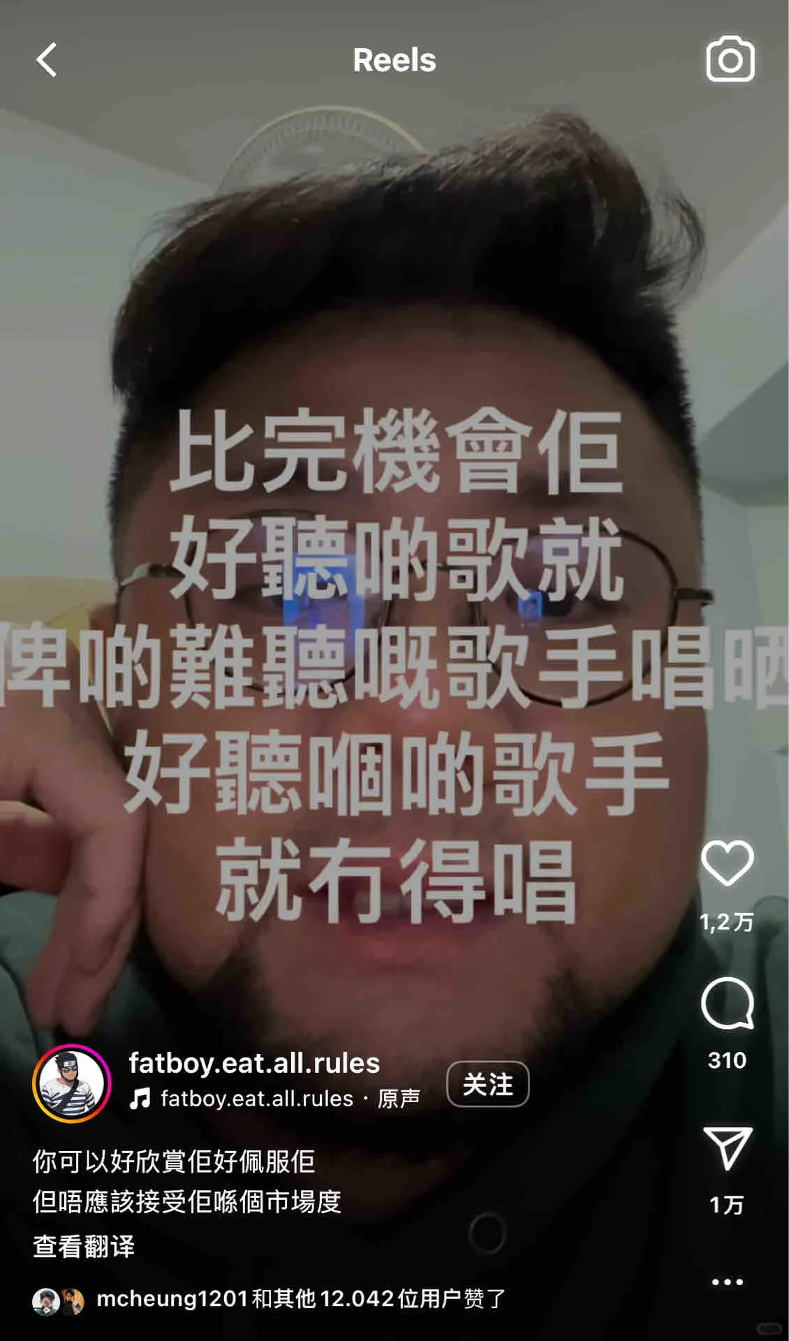 另外,早前IG網紅「嚴重脂肪哥」拍片發表大膽言論:「可唔可以唔好再用『好努力、好努力』嚟形容嗰啲難聽嘅歌手呀?如果好努力都唱得難聽嘅,咪即係你唔適合喺呢行囉!唔見你同啲醫死人嘅醫生講佢好努力嘅?其他行業唔會咁㗎喎,係唱歌呢行先係咁㗎喎,好難聽唱歌走晒音,『不過佢好努力㗎啦,畀次機會佢啦!』,然後好聽嘅歌畀晒啲好難聽、走晒音嘅歌手唱囉,唱得好嗰啲冇得唱!你可以好欣賞佢好佩服佢,但唔應該接受佢喺個市場度」,MC亦有讚好這個貼文。