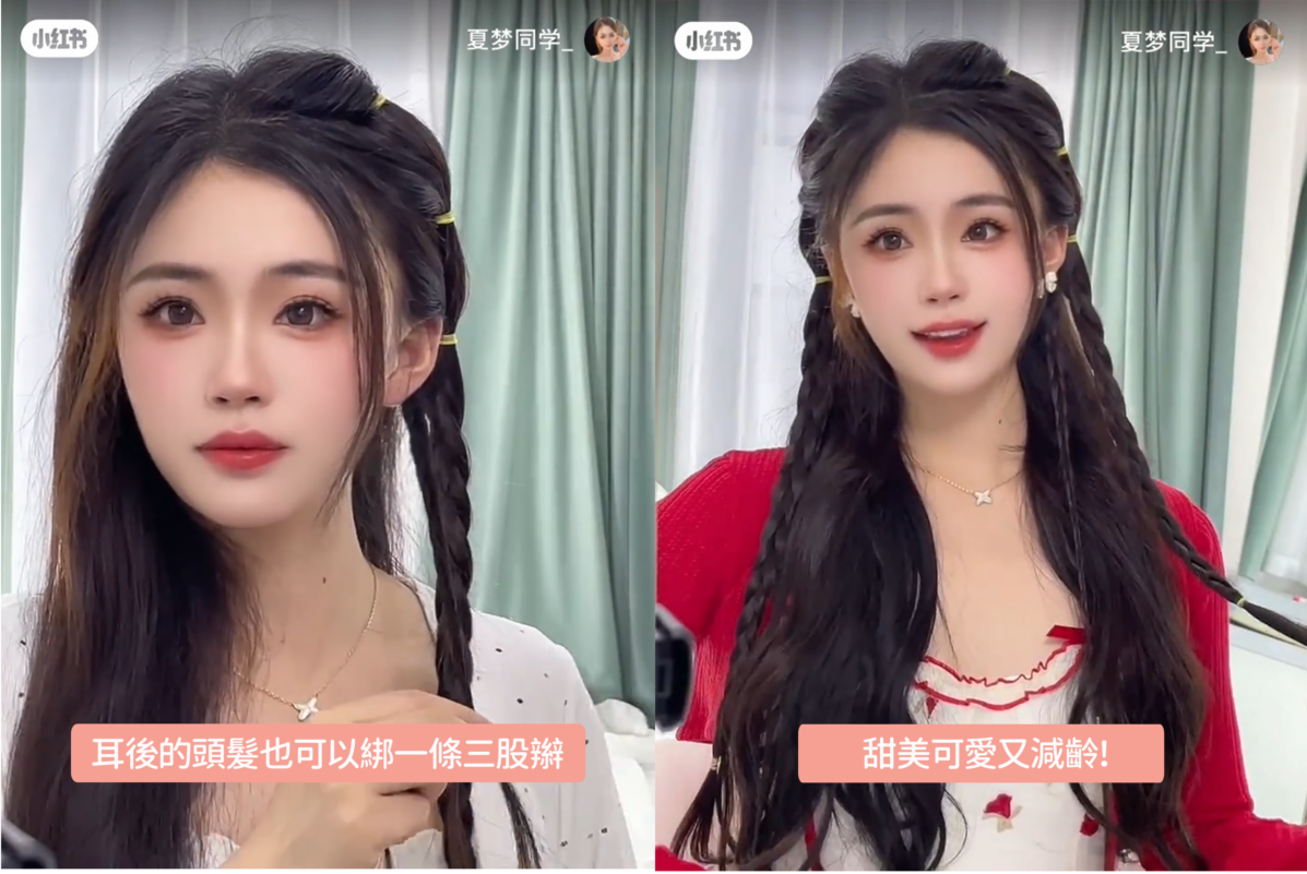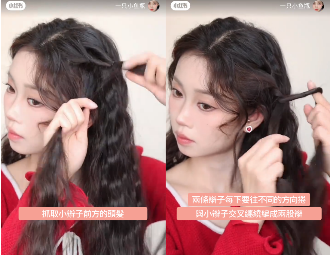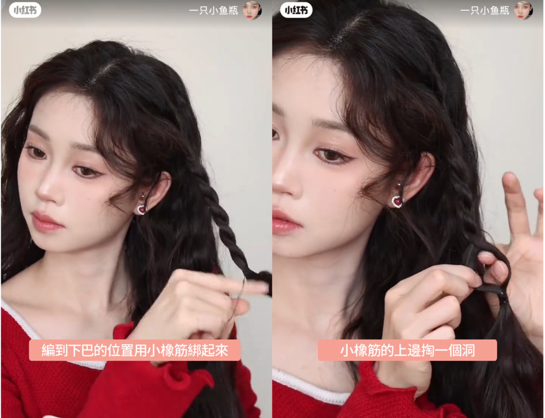 Step 3:耳後的頭髮也可以綁一條幼細的三股辮來增加層次感,另一邊亦重覆一遍便完成了!最後夾上一些可愛的新年頭飾就已經很好看,氛圍感UP~