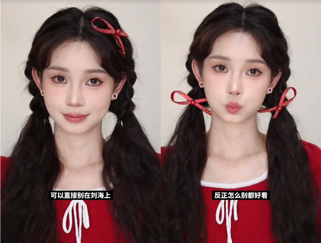 大家同樣可以夾上一些紅色或鮮艷的頭飾,位置也可以隨喜好夾,不論是瀏海或是兩股辮的尾端都很好看,即時增加新年的氛圍感~