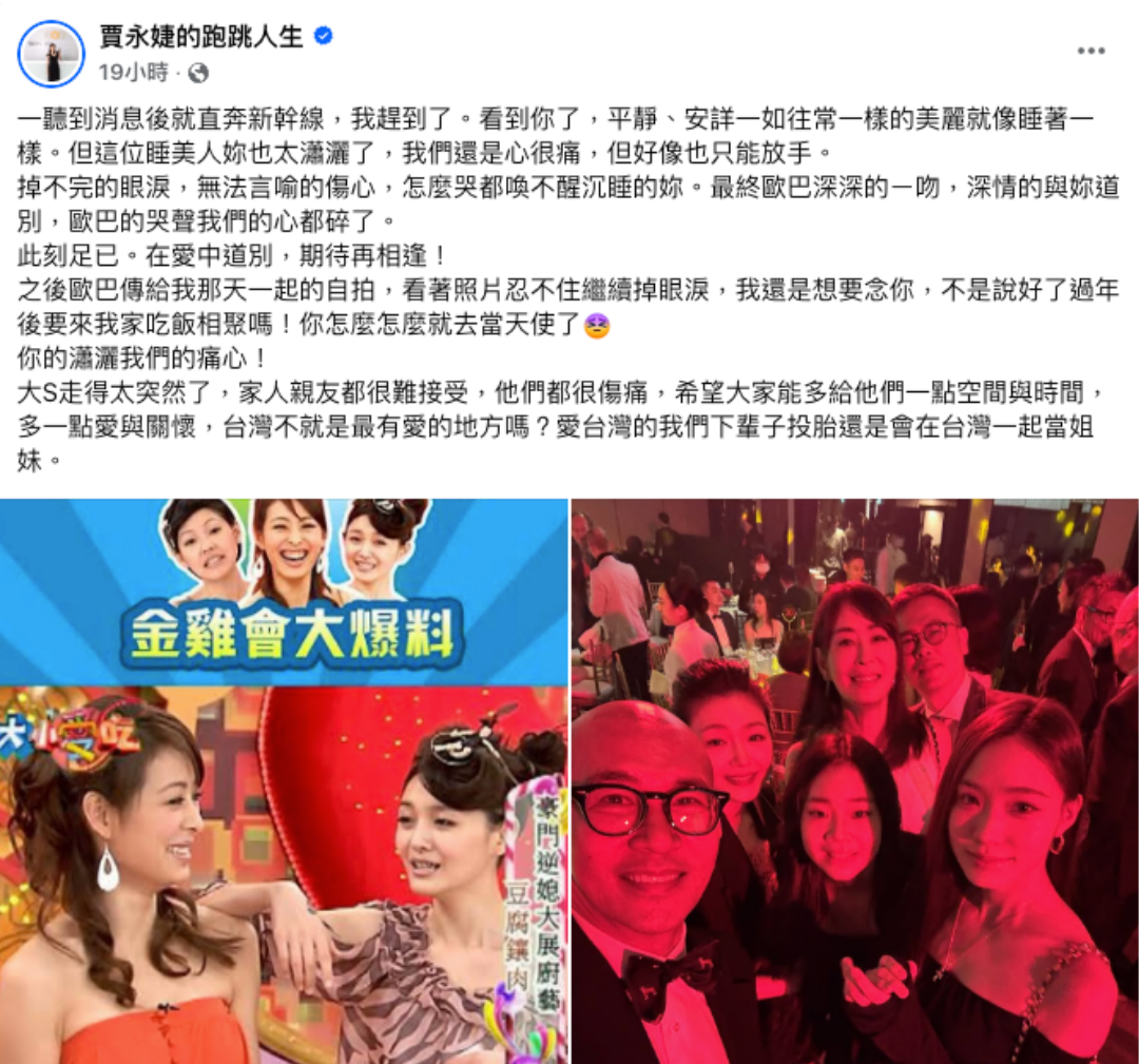 大S好友賈永婕在社交平台發文: 「一聽到消息後就直奔新幹線,我趕到了。看到你了,平靜、安詳一如往常一樣的美麗就像睡着一樣。但這位睡美人妳也太瀟灑了,我們還是心很痛,但好像也只能放手。掉不完的眼淚,無法言喻的傷心,怎麼哭都喚不醒沉睡的妳」。