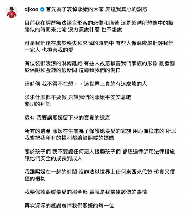他亦有交代大S遺產的去向「所有的遺產,熙媛在生前為了保護她最愛的家族用心血換來的,所以我會把我所有的權利都讓給熙媛的媽媽」,又提到「我不要讓任何惡人接觸孩子們,都透過律師用法律措施讓他們安全的成長到成人」。