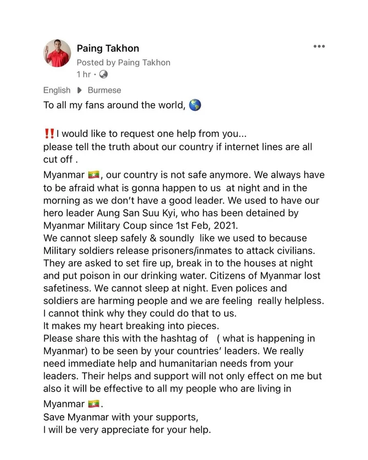 不過同年緬甸發生了軍事政變,Paing Takhon勇敢地公開支持民主運動,結果遭到了軍政府的逮捕,他的社交平台被全面封鎖,甚至被判處3年有期徒刑,直到2022年3月2日才獲特赦提前出獄。出獄後的他積極投身於演藝事業,並經營YouTube與粉絲進行互動,重拾自由生活的節奏。