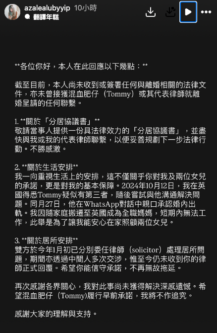 芊蕙子又大爆混血肥仔去年婚內出軌,「2024年10月12日,我在英國得悉Tommy疑似有第三者,隨後嘗試與他溝通解決問題。同月27日,他在WhatsApp對話中親口承認婚內出軌。」另外混血肥仔在聲明指芊蕙子要求將物業轉讓到名下,她則亦有回應:「我因隨家庭搬遷至英國成為全職媽媽,短期內無法工作,此舉是為了讓我能安心在家照顧兩位女兒。」並解釋:「我一向重視生活上的安排,這不僅關乎你(肥仔)對我及兩位女兒的承諾,更是對我的基本保障。」芊蕙又稱兩人在今年1月初已分別委任律師處理居所問題,但仍未收到對方的律師正式回覆,質疑對方故意拖延。